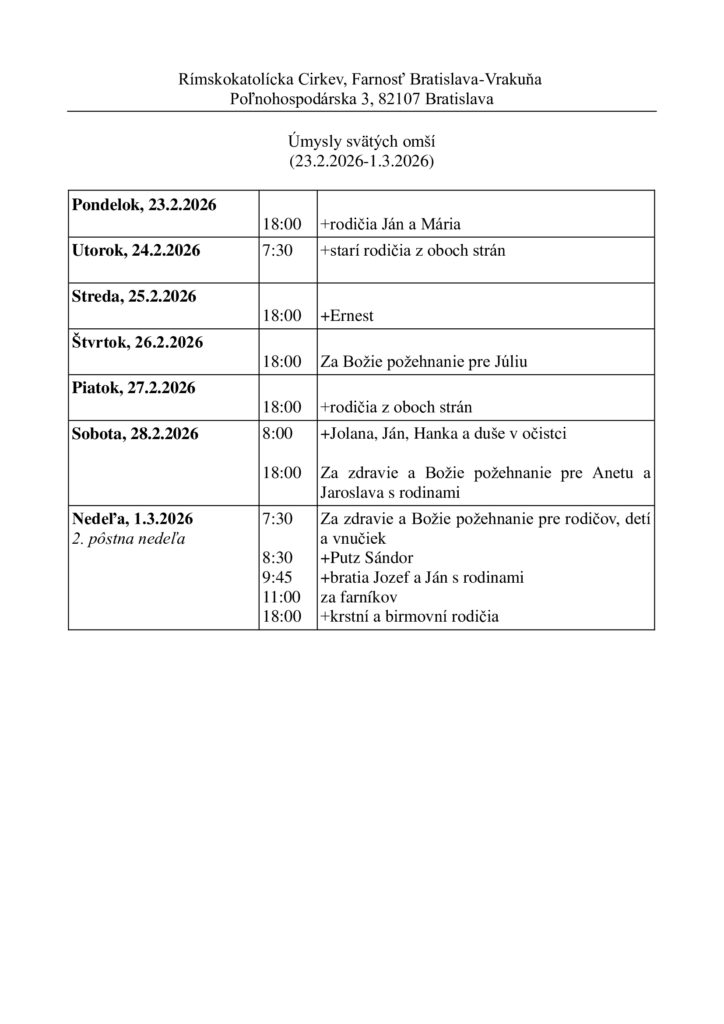 Tento týždeň je prvý piatok v mesiaci, preto po sv. omši bude pobožnosť na prvý piatok. Vysluhovanie sviatosti zmierenia bude pondelok, streda, štvrtok a piatok od 17:00 do 17:45. Štvrtok a piatok aj dopoludnia od 9:00 do 10:00.