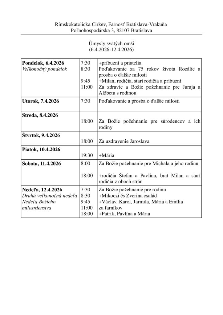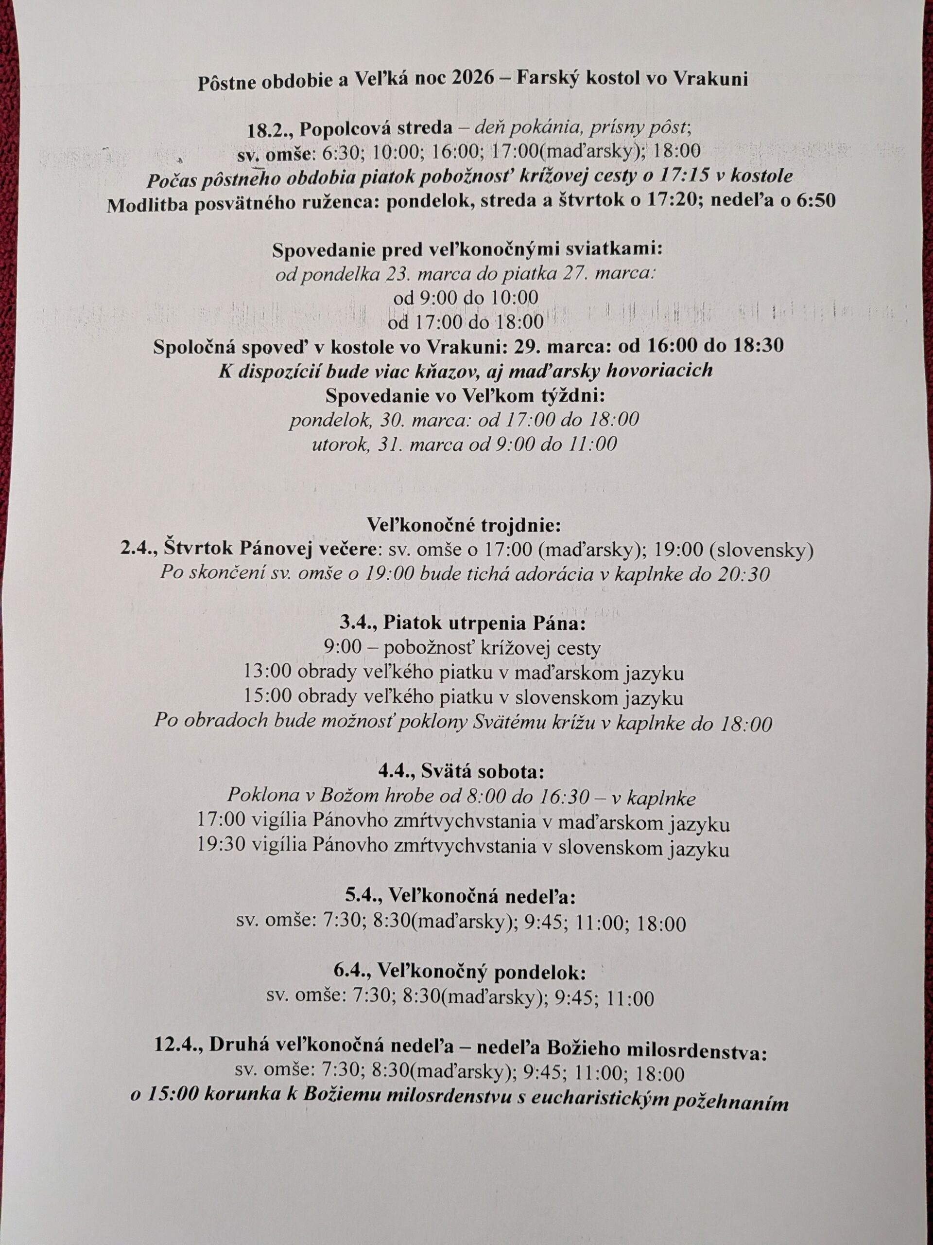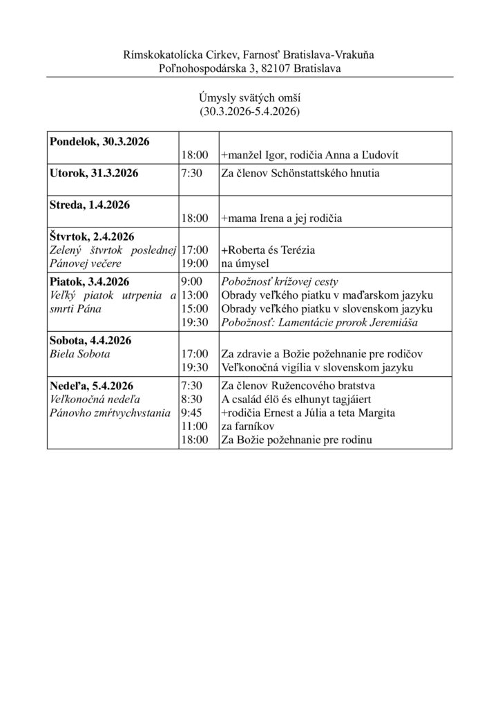 Rozpis spovedania, bohoslužieb ako i poklona v Božom hrobe je na výveske a na našej stránke vrakuna.eu.