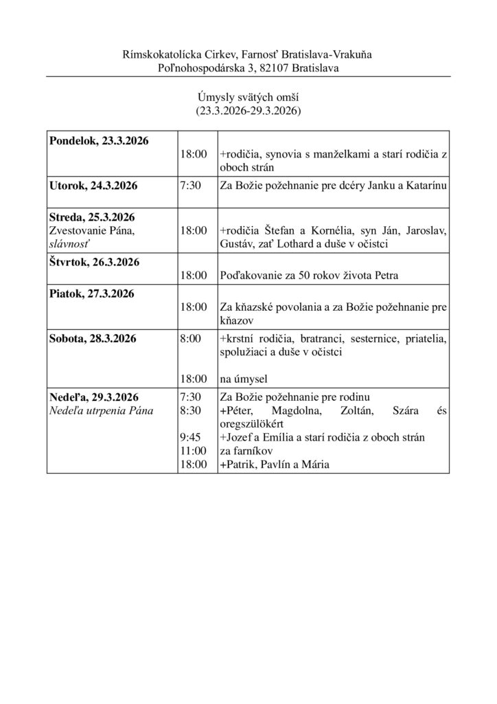 Prosíme, aby ste nám v sakristii nahlásili chorých, ktorí chcú pred veľkonočnými sviatkami prijať sviatosti.